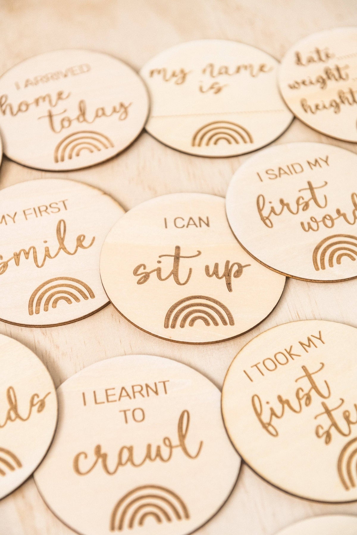 Baby Wooden Milestone Discs are the perfect photo prop for documenting the monthly changes & growth of your new little baby, including exciting milestones for the first year of their life. These keepsake discs make for a great gift for newborn babies or a baby shower!