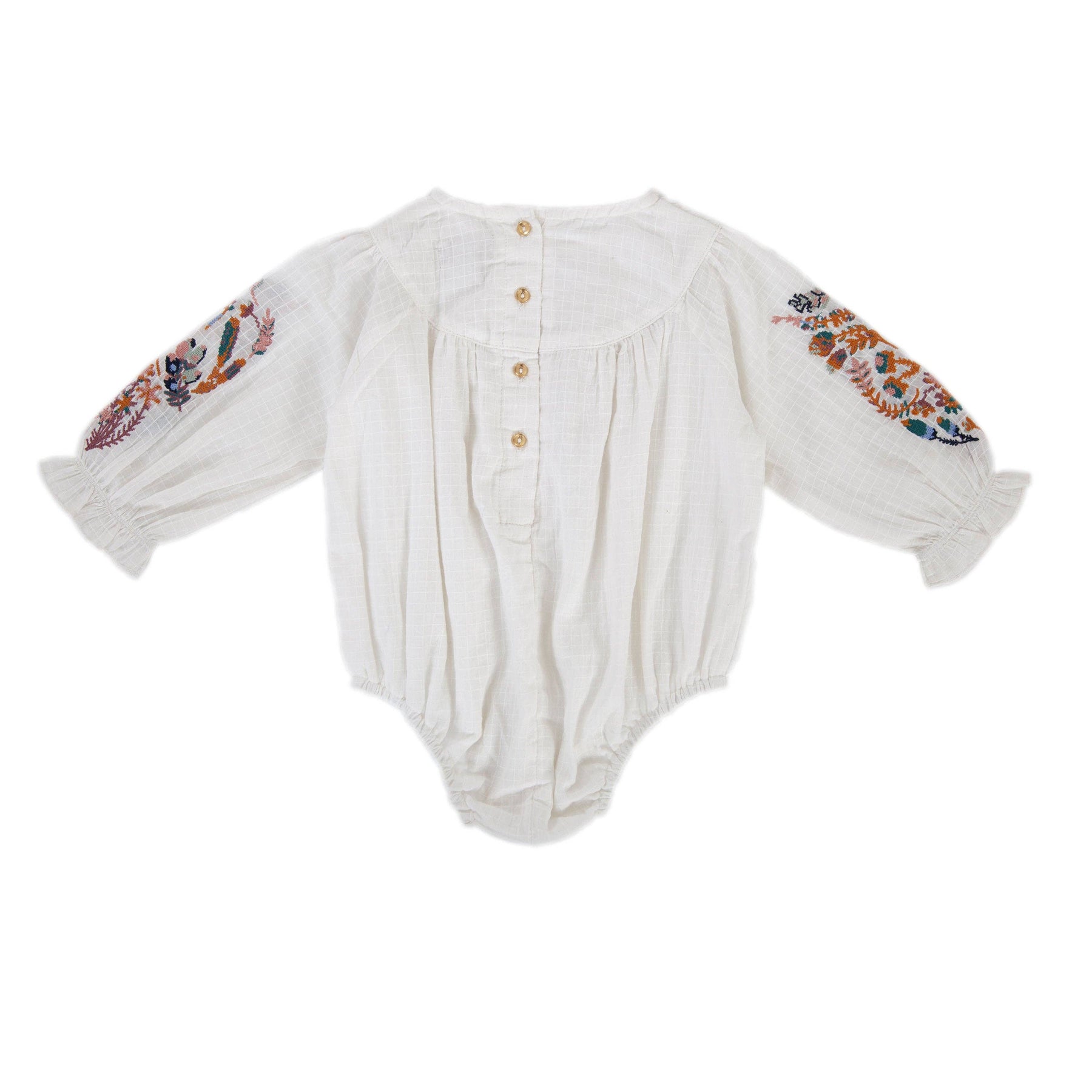Tiny frill at neck, gold buttons down the back, tiny frill on sleeve at wrist.