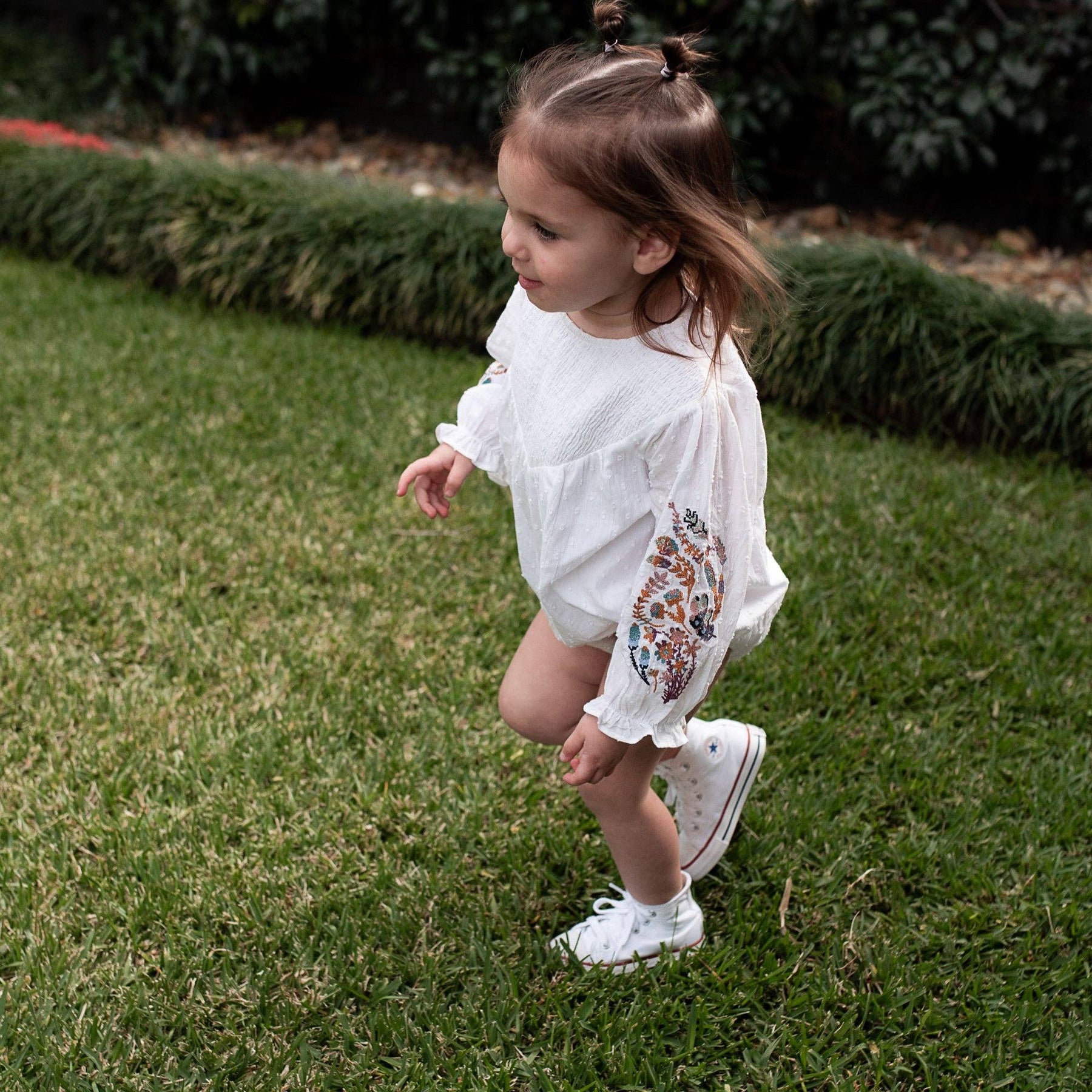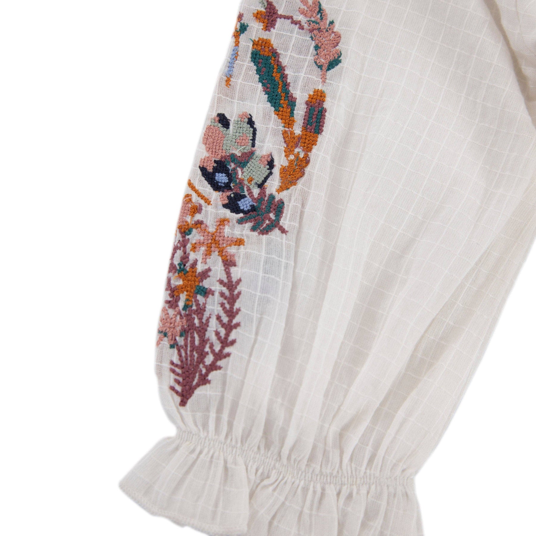 Full sleeve with gorgeous botanical embroidery down the sleeve length.