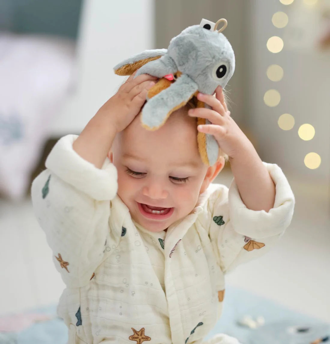 Jelly is a forever helpful friend who is always ready to give you a hand - or seven. This jellyfish rattle is a perfect first toy with sensory features and sweet sounds. Try giving Jelly a soft squeeze and hear the thrilling crinkle sound.