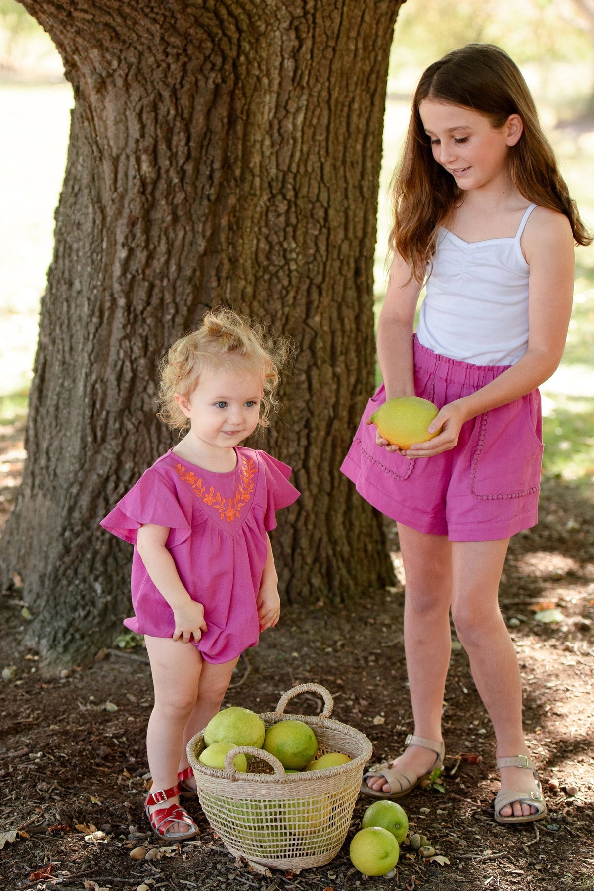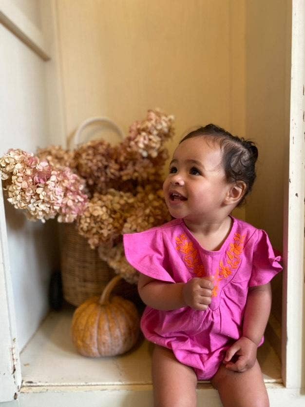 Cotton Flax playsuit in Phlox Pink with 'V' detail and embroidery on chest in a beautiful orange to contrast and tiny stitch detail on flutter sleeve.