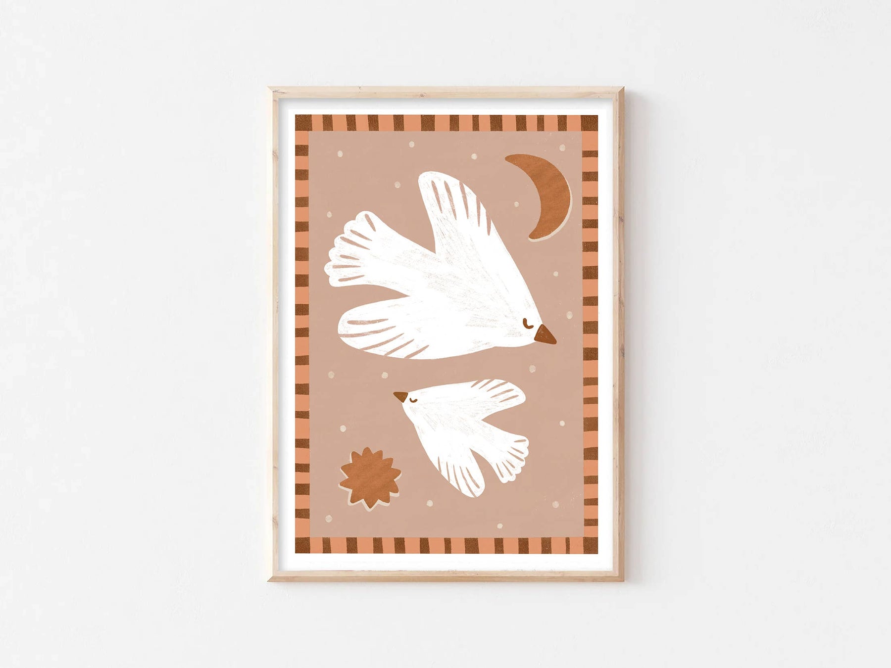 This peaceful art print features two birds flying high together - a symbol of love, protection, and endless possibility. Illustrated in a neutral colour palette, this timeless artwork is designed to not only compliment a nursery or children's room, but work as a contemporary addition to any room.