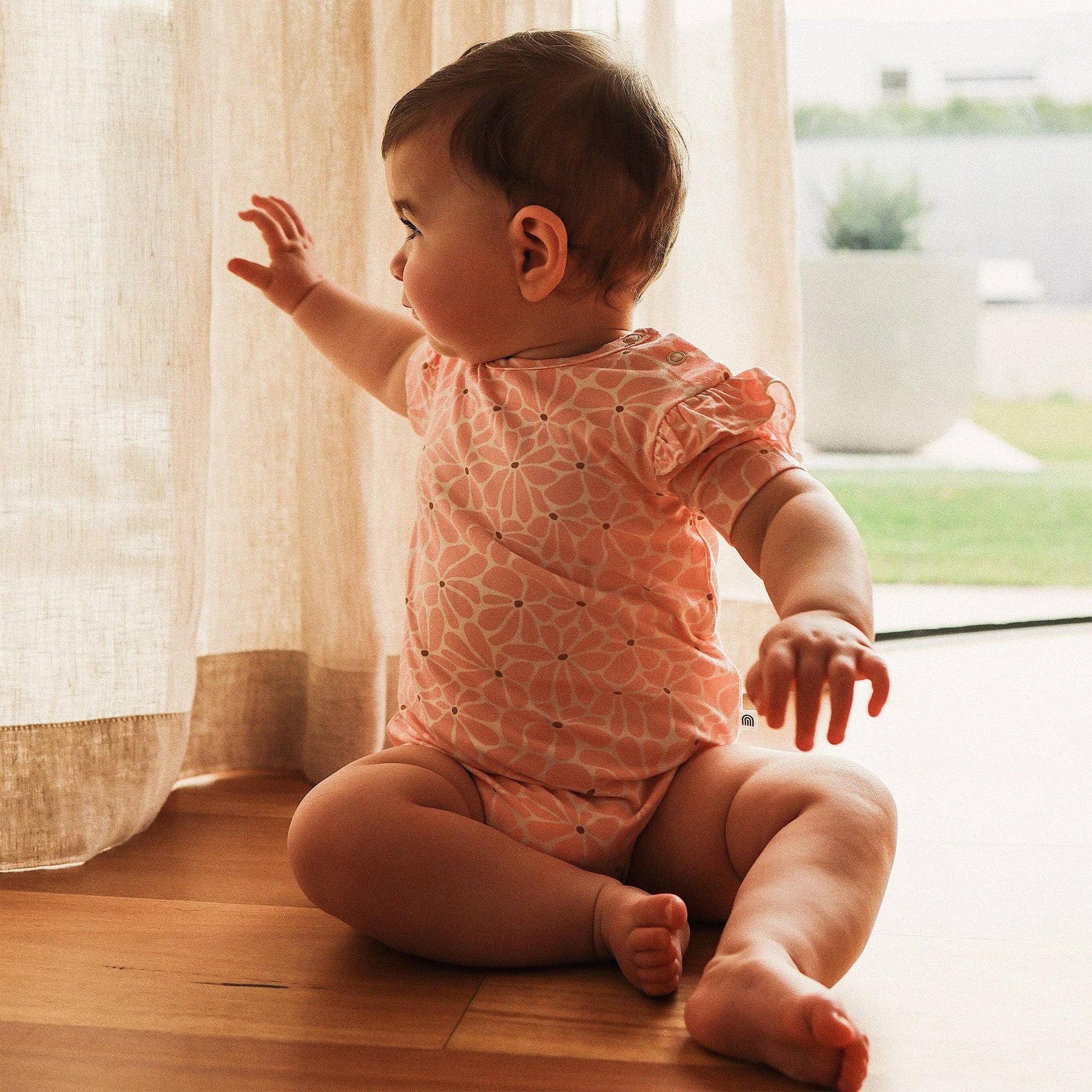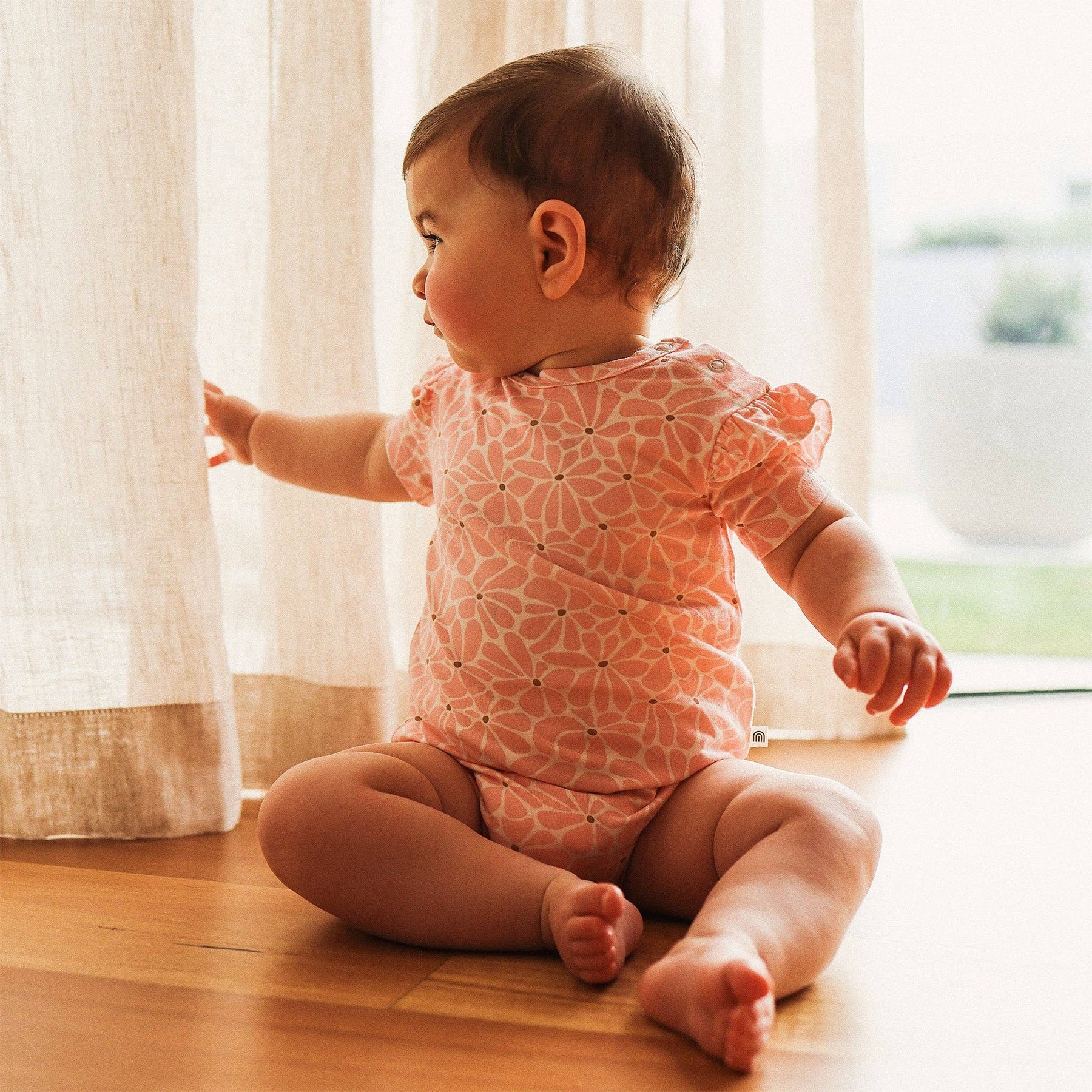 Our Frill Sleeve Bodysuit is crafted from sustainable viscose elastane for soft stretch and all-day comfort. Featuring sweet shoulder frills and convenient crotch snaps, it makes dressing and changing effortless. Breathable, easy to wash, and versatile - it's perfect for everyday wear and active adventures!