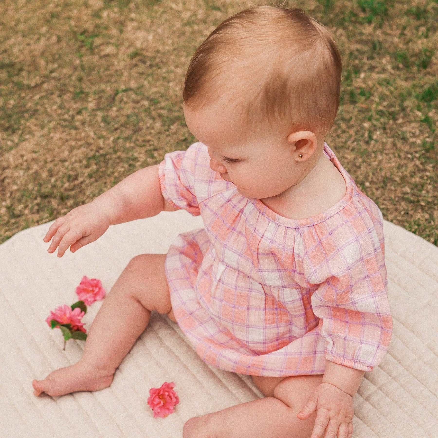 Our pink check LS Bubble Woven Romper is crafted from breathable cotton with a bubble silhouette for easy movement and comfort.