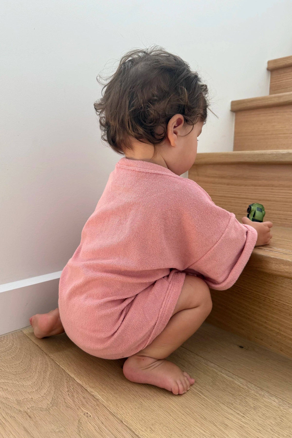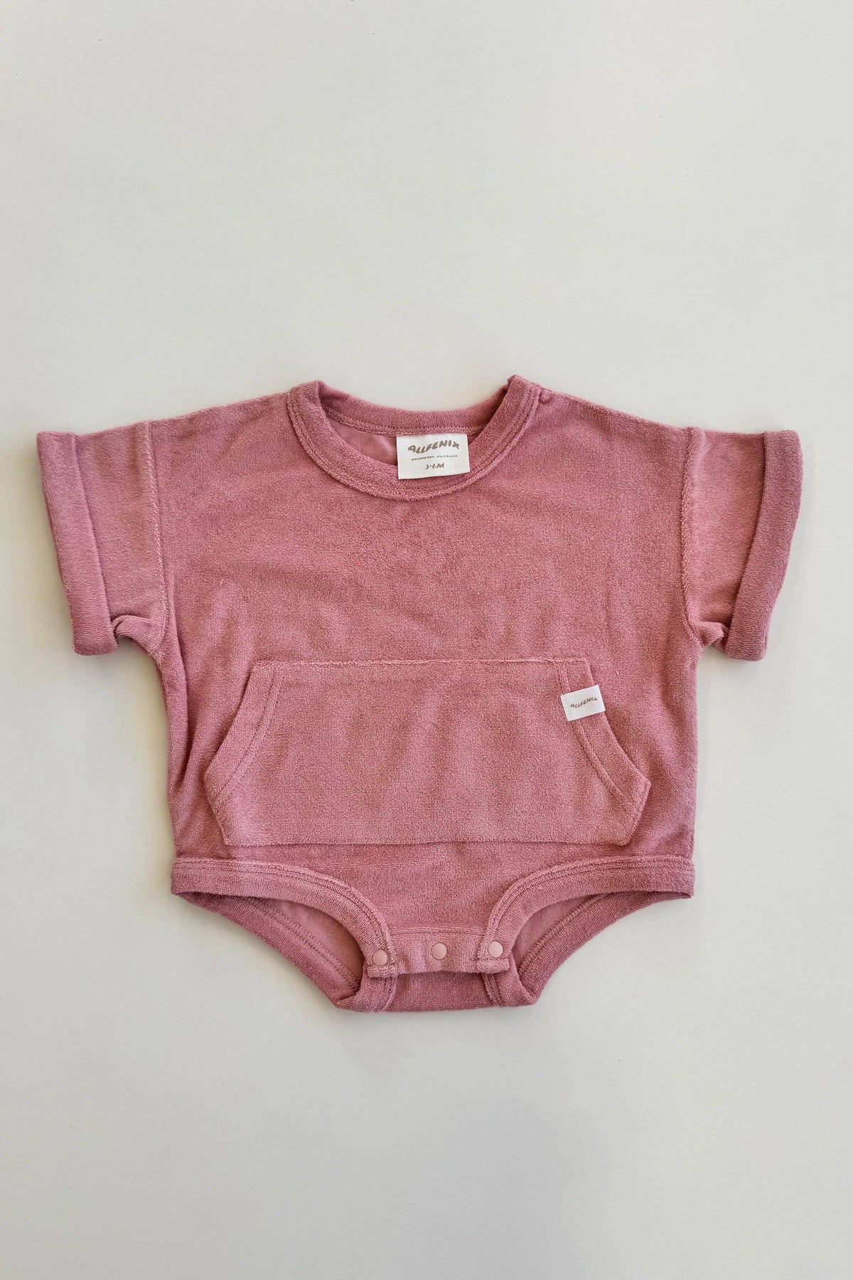 Perfect oversized fit for those summer beach days. Terry Towelling fabric. Self binding crew neckline and leg opening. Dropped shoulders and rolled sleeve design . Kangaroo pocket with patch logo.