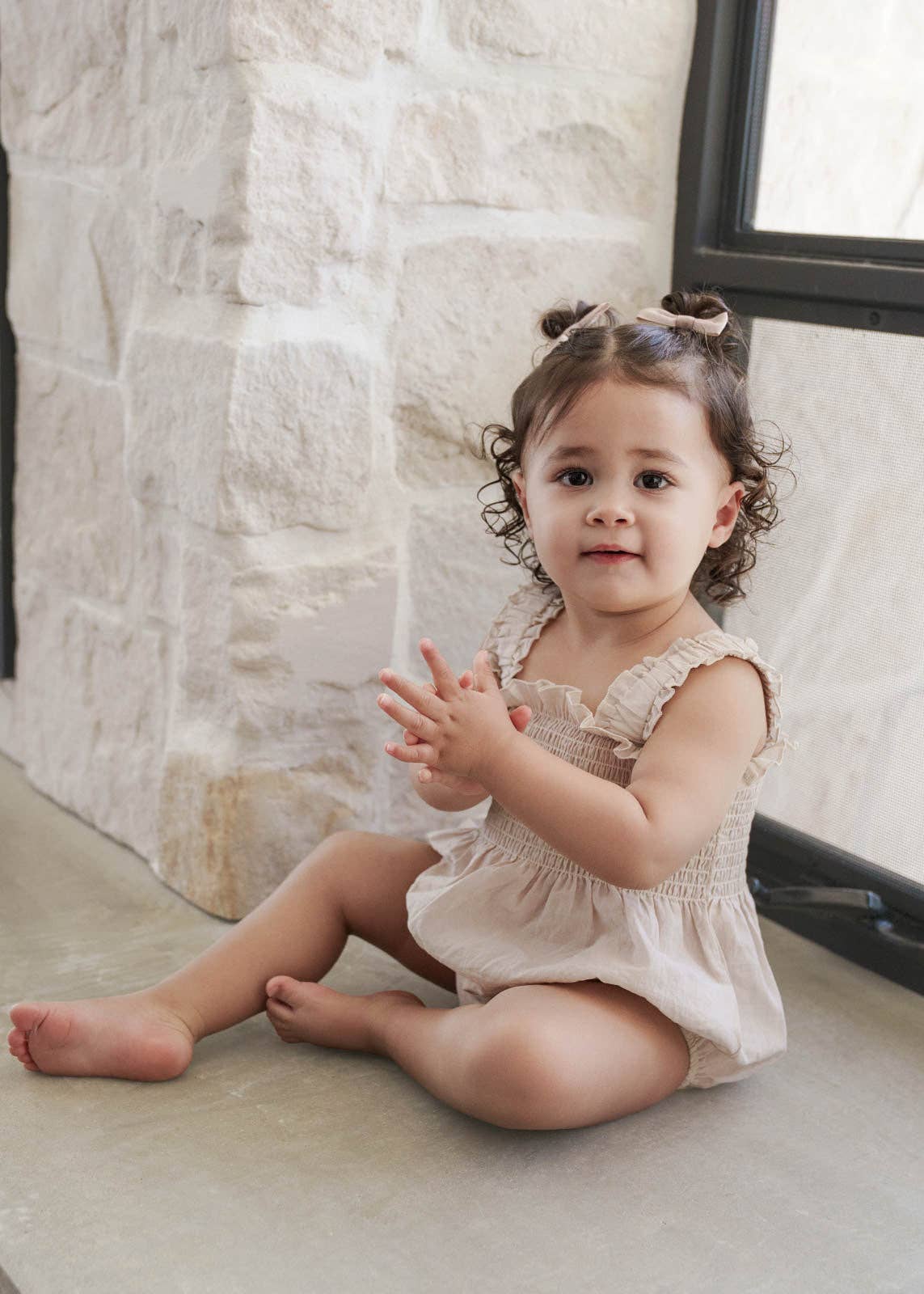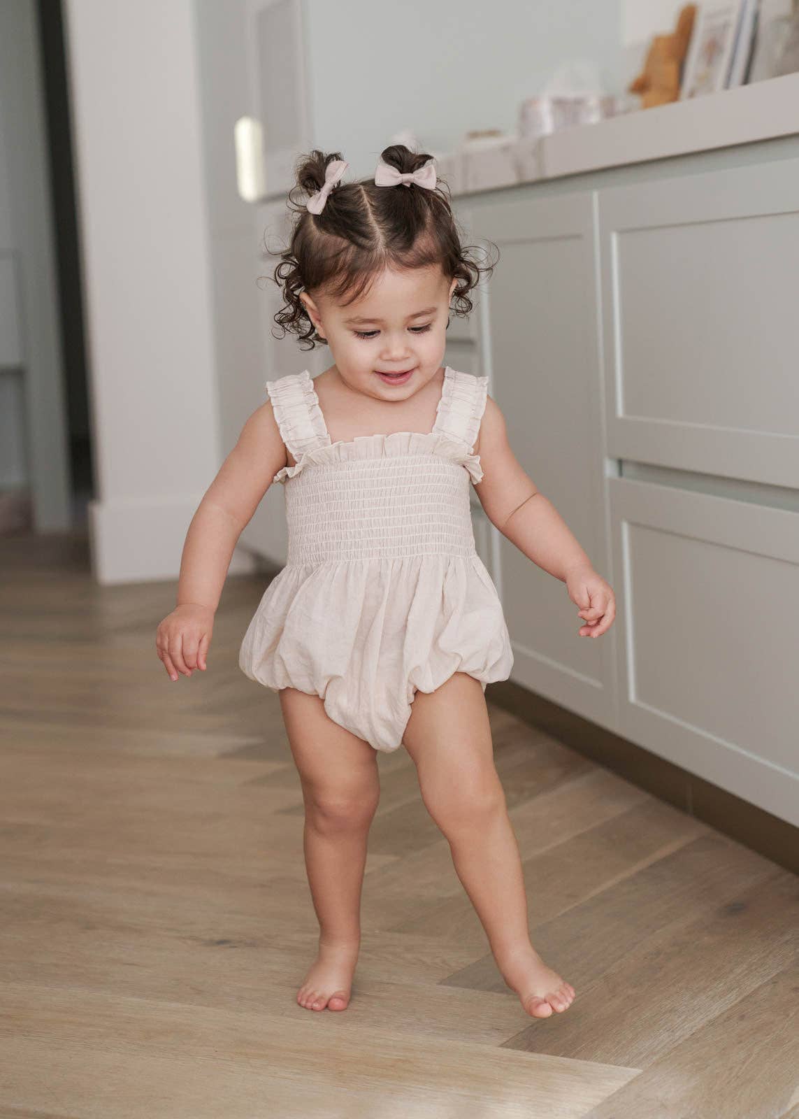 Soft, sweet and made for movement, the Ruby Romper is a beautiful new arrival designed for play-filled days. Available in three dreamy shades: Beige, Pink and White Floral. This romper features a smocked bodice with delicate ruffle straps and a gently bubbled shape for a timeless, comfy fit. Lightweight and breathable, it’s perfect for warm weather adventures, whether they're toddling, crawling or cuddling.