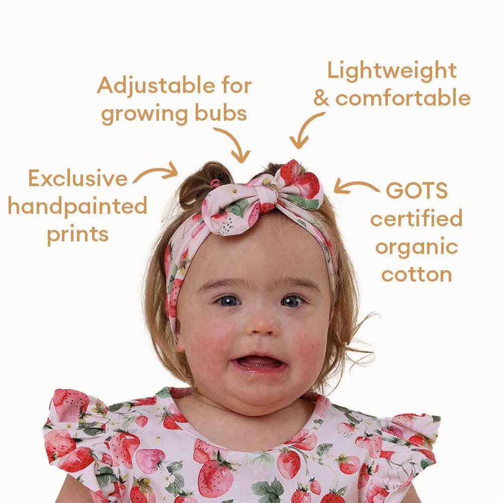 Strawberry is part of our Tutti Frutti collection. Features include: * Exclusive Strawberry design * Lightweight & comfortable for bub * Age 0-2 years * GOTS Certified Organic CU 1182228 * 95% Certified Organic Cotton 5% Elastane Designed in Australia. Made in India.