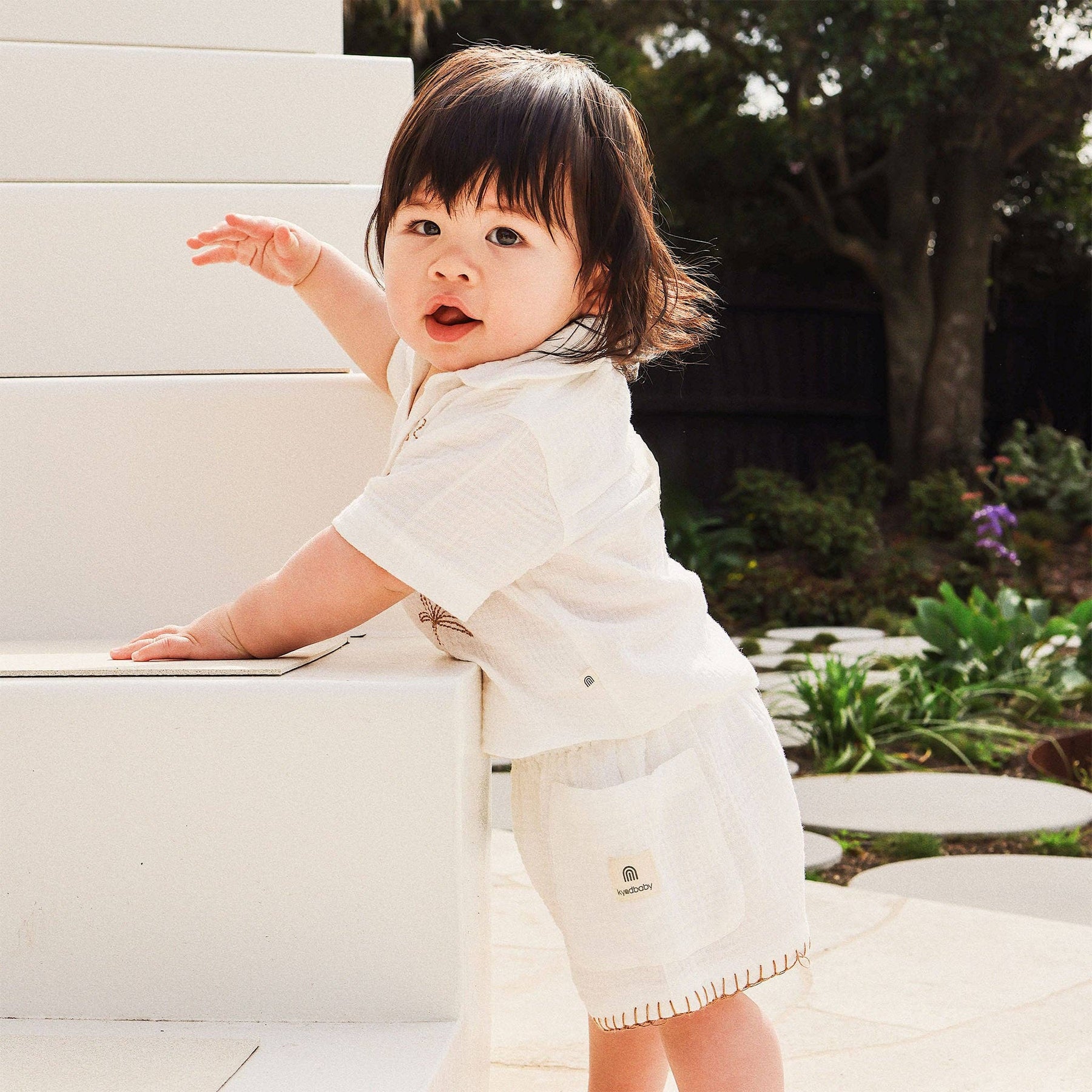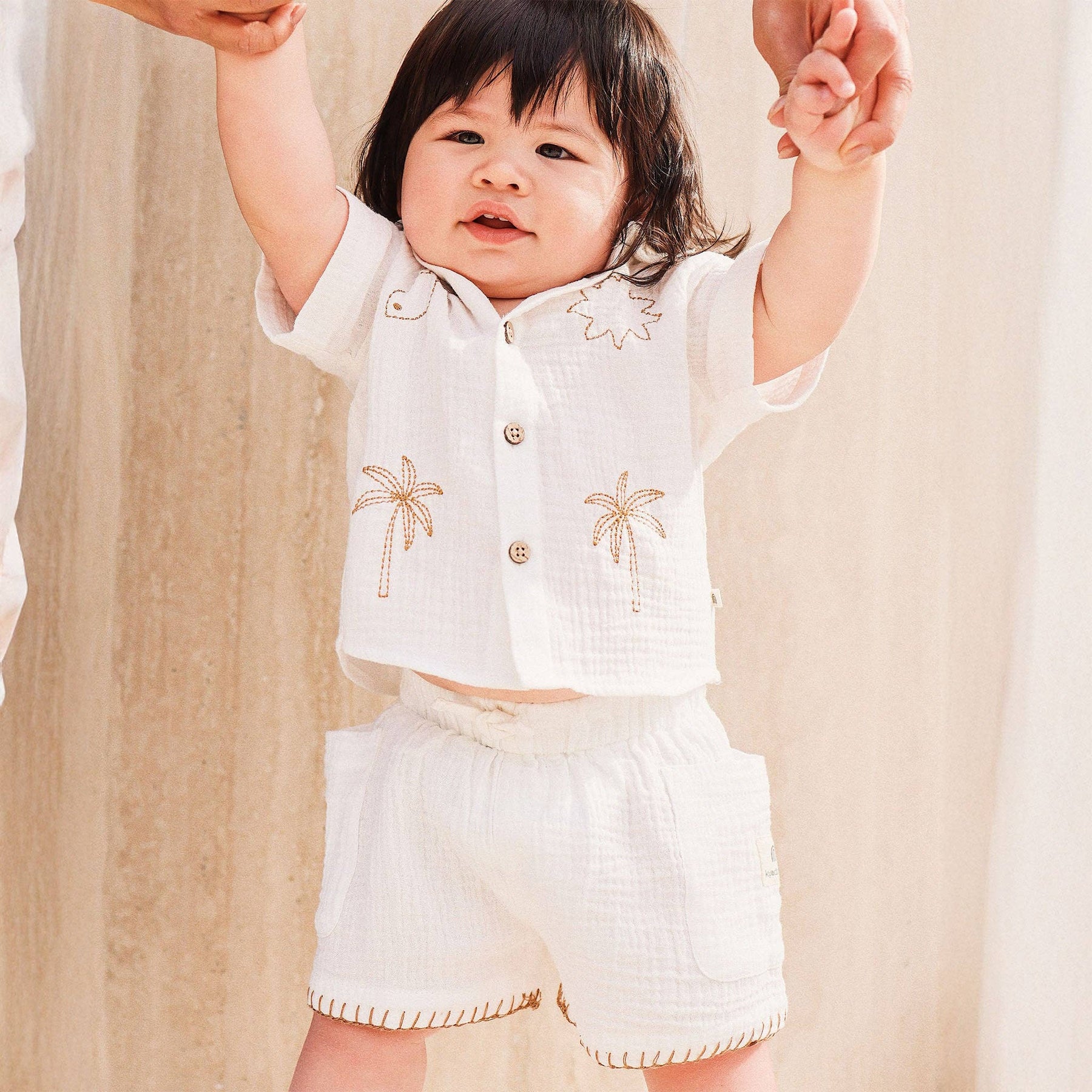 Crafted from soft organic cotton muslin, our breathable Woven Shorts are lightweight and gentle on skin.